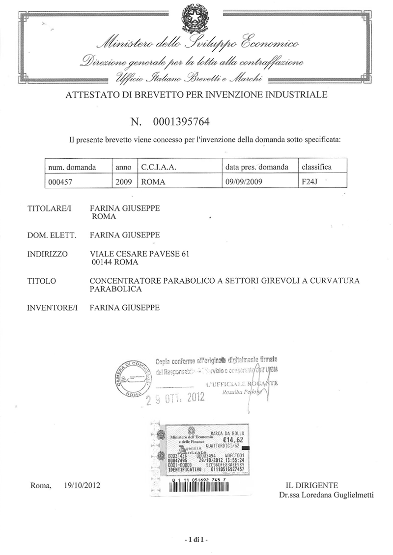 Attestato di brevetto per invenzione industriale N. 0001395764 Certificate of patent for industrial invention No. 0001395764